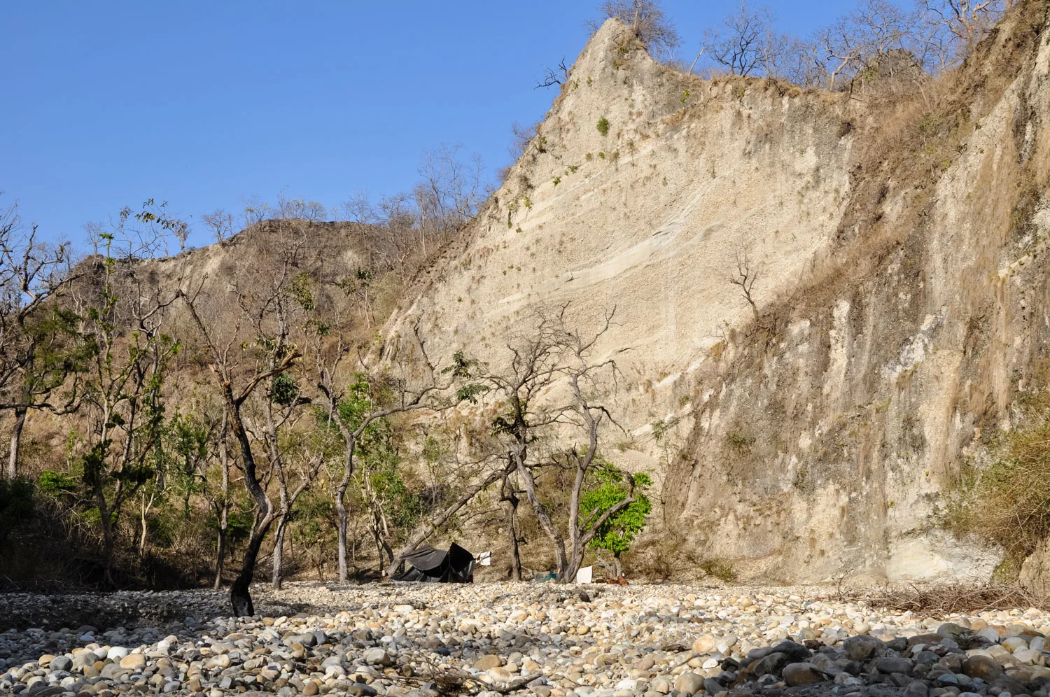 As dawn lit the hills, it became obvious that much of the forest’s foliage had already fallen. The terrain rose around the streambed, and soon the families were winding through canyons, between sheer walls of exposed sedimentary strata and jagged hills speckled with brown grasses and bare trees. Every so often, they would pass other Van Gujjar deras, some already empty, some still occupied. From people who hadn’t yet left, Dhumman learned that his family had already passed the last of the water in the drainage. They wouldn't find any more until they'd emerged from the Shivaliks.