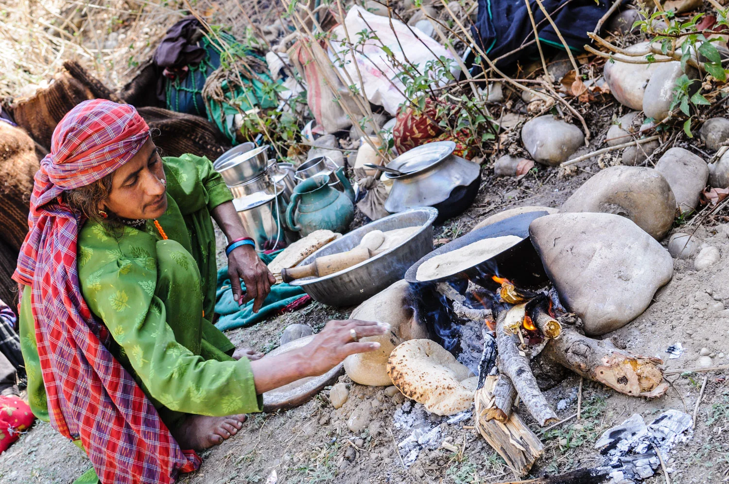 Jamila and Roshni set up their camps in the streambed, about fifty yards apart from each other. The horses and bulls were unloaded, and the saddlebags, water jugs, food sacks and cooking pots were neatly stacked on the ground. Firewood was gathered, water was hauled, and Jamila got busy in the kitchen, making dough, rolling chapattis, and cooking them on a pan; they’d be eaten later, smeared with butter and spicy chili paste.